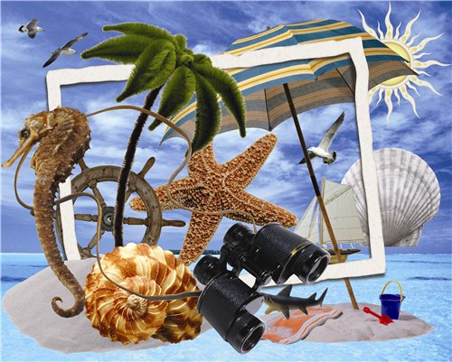 (морские звезды, ракушки, пляжный зонт, пальма, бинокль, чайки, яхта, штурвал)